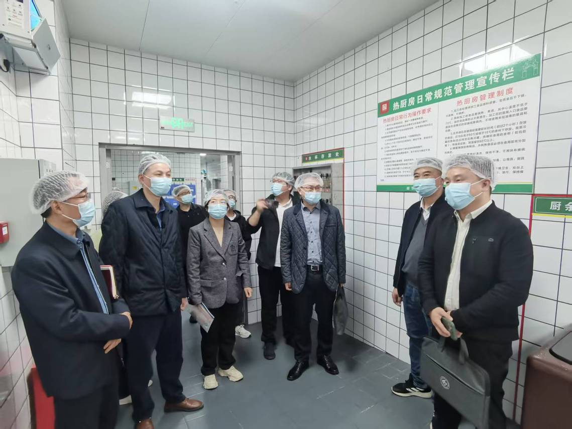 随后,罗勇一行来到闳约餐厅现场进行参观调研,后勤公司饮食中心相关负责人引导大家参观了闳约餐厅的就餐区、后厨操作间、仓库等场所,并详细介绍了闳约餐厅的食品安全管理系统。