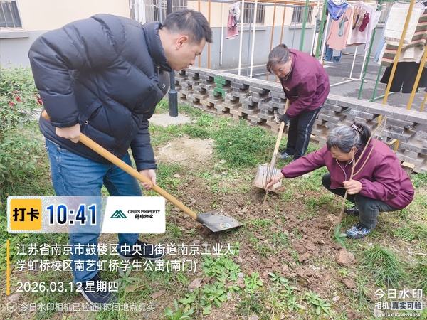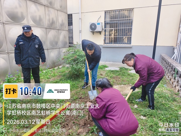 同一时间,在虹桥学生公寓,科瑞物业团队的员工们用一场扎扎实实的绿化养护,为同学们的居住空间增添新的生机。物业员工带着工具进入草坪,修剪高低不齐的草叶,徒手拔除扎根的杂草,给园区里的老树修整树冠。打理完毕后,大家又在公寓围墙旁种下五棵带着花苞的小梨树,待到春天开花、秋天结果,将为同学们的校园生活增添一份值得期待的小惊喜。在公寓西北角,物业专门腾出一块空地打造“共享花境”,翻松土地、改良土壤后,播撒了月季、玫瑰、康乃馨等各色花种,等到初夏就能开出一整片错落的花境。